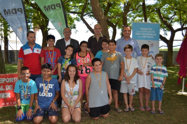 El director general de Planificación Sociosanitaria, Farmacia y Atención al Ciudadano, Arturo Giménez, el alcalde de San Javier, Juan Martínez y el concejal de Deportes, Carlos Albaladejo entregaron hoy las medallas a los 12 niños que han participado en el campus del programa "Activa Familias" que se clausuró esta mañana en el Polideportivo Municipal de San Javier.