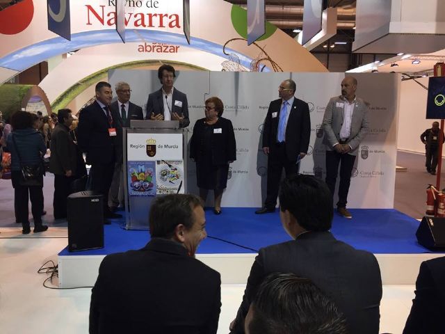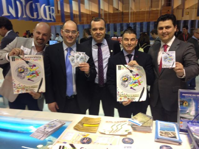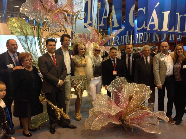 El consejero de Industria, Turismo, Empresa e Innovación, Juan Carlos Ruiz apoyó hoy con su presencia al Carnaval de Santiago de la Ribera que ha desembarcado en Fitur donde se ha presentado oficialmente con una amplia representación municipal, así como de la comisión de comparsas, y la pareja formada por la Musa Rosario García y el Muso David Ferrer, que aportaron el color y el calor de una fiesta que está a punto de conseguir la Declaración de Interés Turístico Regional.