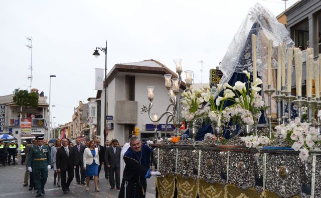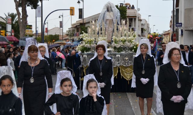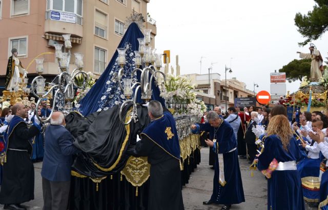 La intermitente lluvia que durante toda la mañana ha caído en el municipio marmenorense no ha impedido la celebración del tradicional encuentro de la Virgen de los Dolores con Jesús Resucitado, ante la imagen de San Juan Evangelista, aunque ha obligado a retrasar la procesión y acortar el itinerario habitual.