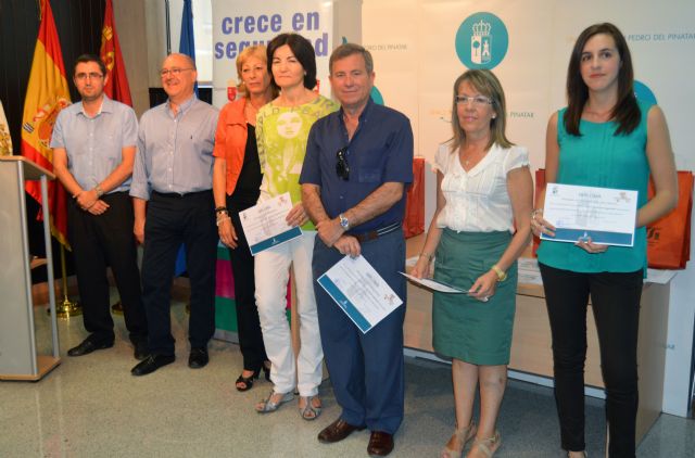 La concejal de Educación del Ayuntamiento de San Pedro del Pinatar, Guadalupe García, y el jefe de Formación del Instituto de Seguridad y Salud Laboral (ISSL), César López, han entregado hoy los premios de la campaña “Crece en Seguridad” 2013-2014 en el ayuntamiento del municipio.