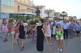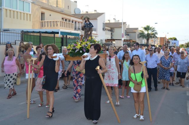 Los vecinos de El Mojón celebraron ayer la festividad de San Roque con una procesión de su imagen, portada a hombros por mujeres y acompañada por la banda de música Unión Musical, que recorrió las principales calles de la pedanía costera, desde la sede de la asociación de vecinos hasta la explanada aledaña al paseo marítimo.