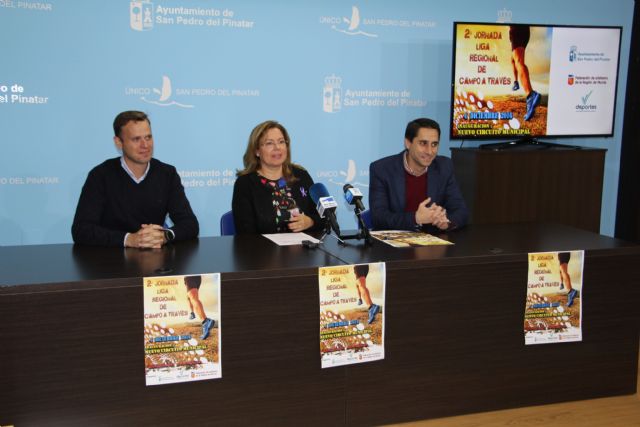 La alcaldesa de San Pedro del Pinatar, Visitación Martínez, junto al presidente de la Federación Murciana de Atletismo, Juan Manuel Molina, y el concejal de Deportes, Daniel Pérez, han presentado la segunda jornada de la Liga Regional de Campo a través, que se celebrará el próximo domingo, 4 de diciembre, en la nueva pista de cross municipal y que espera albergar a más de 700 corredores.