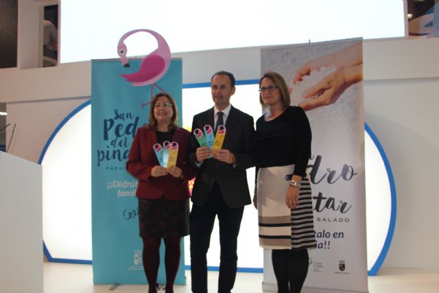 La alcaldesa de San Pedro del Pinatar, Visitación Martínez, acompañada del consejero de Turismo de la Región de Murcia, Javier Celdrán, y la concejala de Turismo de la localidad, Slvia Egea, ha presentado hoy en el stand de la Región de Murcia de FITUR la oferta turística de la localidad para 2018, que refuerza la campaña "Paraíso salado", orientándola al turismo familiar con nuevas propuestas como más visitas guiadas, actividades en las playas en invierno o un evento gastronómico con el langostino del Mar Menor como protagonista.