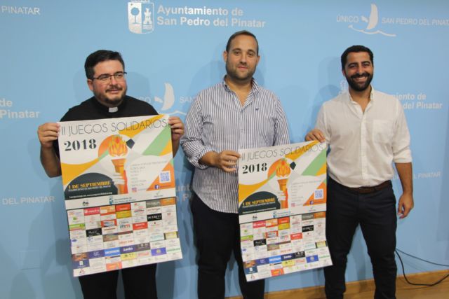 El concejal de Deportes de San Pedro del Pinatar, Javier Castejón, junto al párroco de la localidad, Roberto Burgos y José Ángel Pardo, en representación de los jóvenes de la parroquia, han presentado hoy en rueda de prensa los II Juegos Solidarios, que se celebrarán el sábado 1 de septiembre, a partir de las 18:00 horas, en el polideportivo municipal.