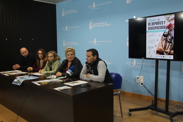 La concejal de Bienestar Social, Francisca Pelegrín, acompañada por Pedro J. Sánchez Martínez (Coordinador deportivo de Aidemar), Manuel Guillen Carrión (Gerente de tu Alberguejt y Presidente del CDA Levante), Sonia Lorca Manzano (Presidenta Club deportivo adaptado Murcia) y la psicóloga de Servicios Sociales del Ayuntamiento, Pilar Martínez Invernón, ha presentado hoy las primeras jornadas de Deportes y Discapacidad que se celebrarán con motivo del Día internacional de las Personas con Discapacidad.