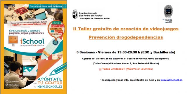 El Centro de Ocio y Artes Emergentes de San Pedro del Pinatar acoge a partir del 25 de enero un taller gratuito de programación de videojuegos, dirigido a jóvenes de 12 a 18 años, que constará de cinco sesiones, con el objetivo de fomentar pautas para tener un estilo de vida saludable y evitar el consumo temprano de tabaco y otras drogas.