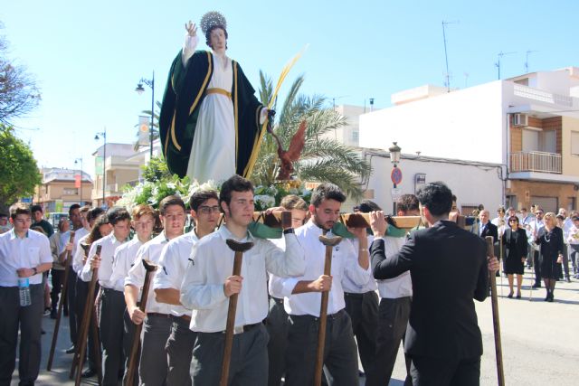Un cortejo procesional de alumnos del Colegio San Pedro Apóstol ha trasladado hoy la imagen de San Juan Evangelista desde el centro escolar hasta la iglesia de la Santísima Trinidad.