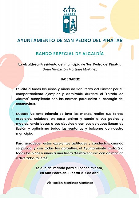 Visitación Martínez ha decretado hoy un bando especial para felicitar a los niños pinatarneses que están cumpliendo de manera admirable las normas para evitar el contagio y propagación del Coronavirus.