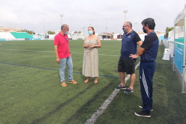La alcaldesa de San Pedro del Pinatar, Visitación Martínez, acompañada por el concejal de Deportes, Pedro Vivancos, han visitado esta mañana las obras de mejora y mantenimiento del campo de fútbol José Antonio Pérez de Lo Pagán.