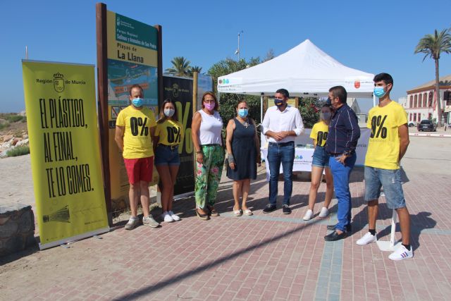 El consejero de Agua, Agricultura, Ganadería, Pesca y Medio Ambiente, Antonio Luengo, acompañado por la alcaldesa de San Pedro del Pinatar, Visitación Martínez y la concejal de Medio Ambiente, Silvia Egea, ha presentado hoy en la playa de La Llana la campaña de sensibilización ambiental 'Cero Plásticos en Espacios Naturales', que se desarrollará en los Parques Regionales de Salinas y Arenales de San Pedro del Pinatar y de Calblanque.
