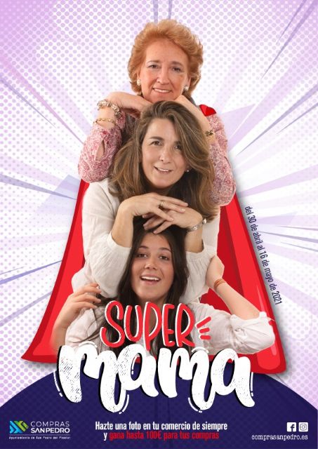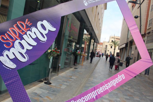La campaña comercial "Supermamá" comenzará el día 30 de abril y se extenderá hasta el 16 de mayo. Consiste en enviar a comercio@sanpedrodelpinatar.es una foto selfie realizada en el photocall del Día de la Madre que la concejalía de Comercio suministrará a las tiendas adheridas a la campaña. Seguidamente, la Concejalía subirá la foto a su Facebook y obtendrán un premio de 200 euros las tres fotos que más "Me Gusta" obtengan en la semana del 7 al 16 de mayo.