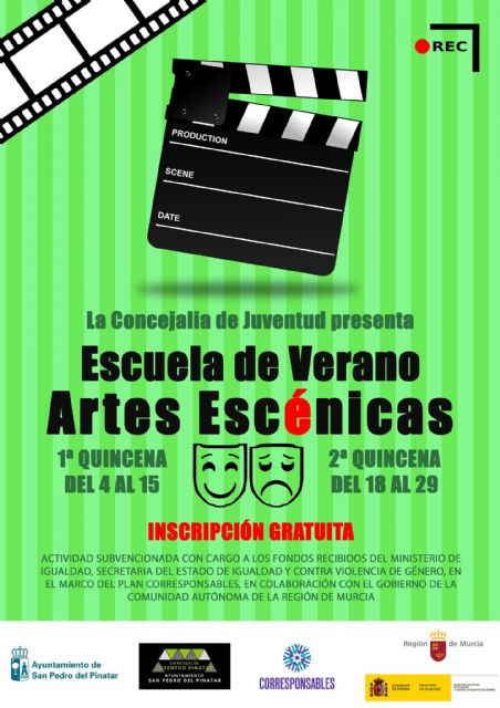 La concejalía de Juventud de San Pedro del Pinatar lanza este verano una escuela de verano de artes escénicas gratuita, dirigida a niños de 6 a 12 años, actividad subvencionada con cargo a los fondos recibidos del Ministerio de Igualdad en el marco del plan Corresponsables, en colaboración con la Comunidad Autónoma de la Región de Murcia.
