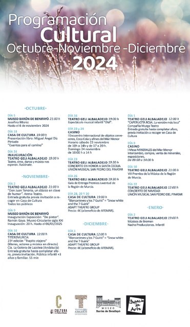 La concejalía de Cultura de San Pedro del Pinatar ha programado una veintena de actividades durante el último trimestre del año en las que se incluyen actuaciones en este nuevo espacio, además de otras propuestas en el Museo Barón de Benifayó y la Casa de Cultura.
