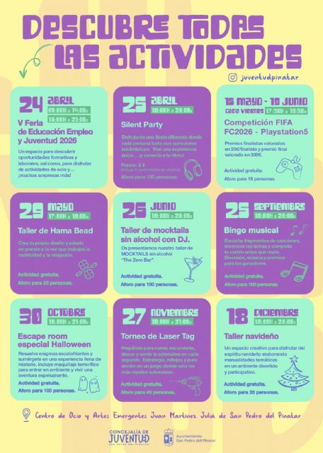 Todas las actividades se desarrollarán en el Centro de Ocio y Artes Emergentes Juan Martínez Julia, consolidando este espacio como punto de encuentro para el ocio juvenil en el municipio. Con esta iniciativa, el Ayuntamiento de San Pedro del Pinatar refuerza su compromiso con la juventud, ofreciendo alternativas de ocio saludables, accesibles y adaptadas a sus intereses.