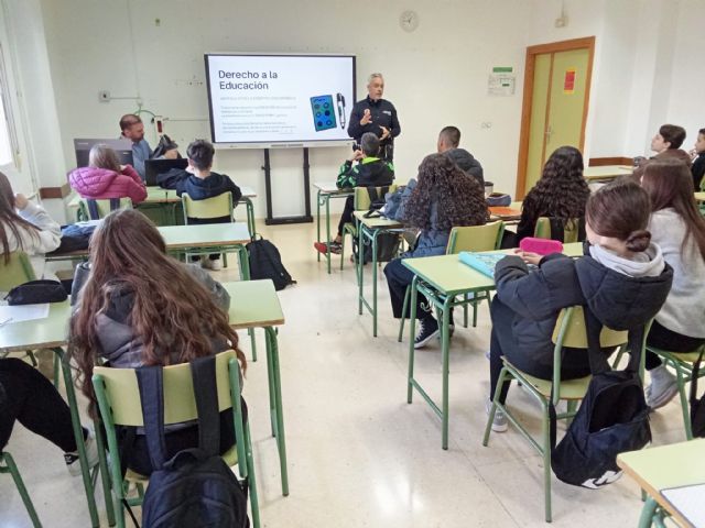 El agente tutor de la Policía Local de Santomera ha realizado en las últimas semanas, a petición del I.E.S. Poeta Julián Andújar, unas charlas en este centro educativo para concienciar al alumnado sobre las consecuencias legales de conductas contrarias a las normas.