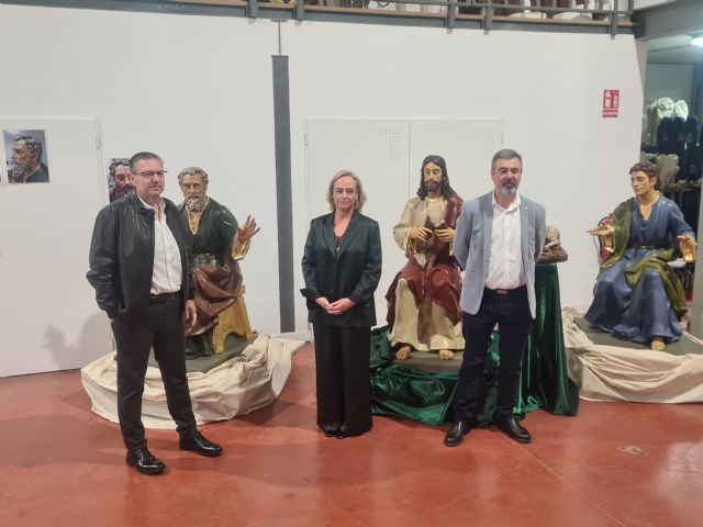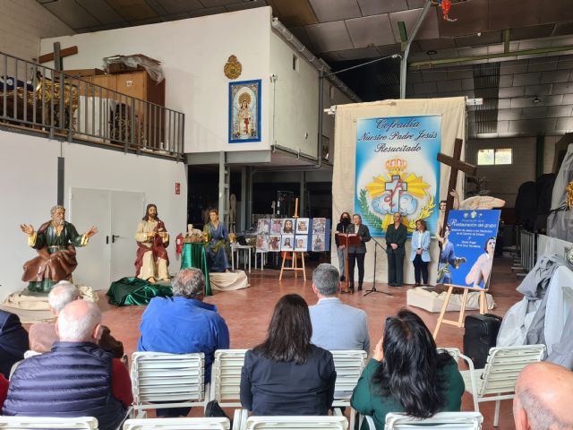 El almacén de tronos de la Real e Ilustre Cofradía de Nuestro Padre Jesús Resucitado se ha convertido esta mañana en una sala de exposiciones en la que se ha presentado la restauración del grupo escultórico de Federico Coullaut-Varela de los Discípulos de Emaús, así como la intervención llevada a cabo en la imagen del Santo Ángel de la Cruz Triunfante, obra de José Antonio Hernández Navarro.