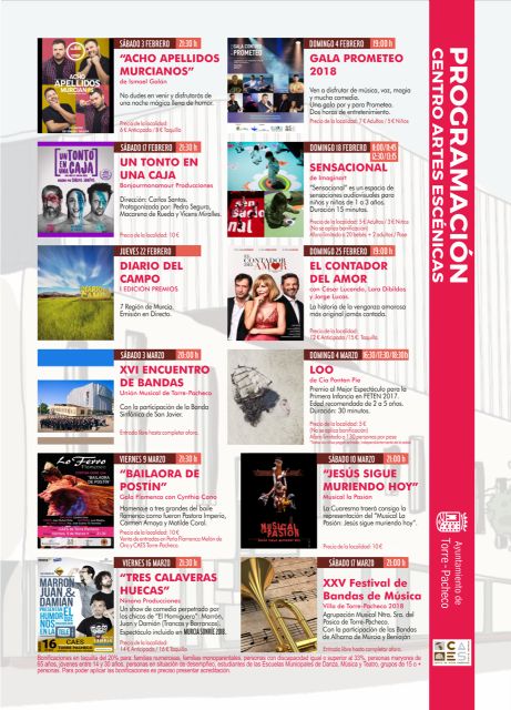 "Acho apellidos murcianos" de Ismael Galán, el próximo sábado, será el primer espectáculo de esta programación, una cita donde el público disfrutará de una noche llena de humor. Las Asociaciones y colectivos del municipio también tienen su espacio, con la Gala Benéfica de Prometeo "Contigo", el XVI Encuentro de Bandas de la Unión Musical de Torre-Pacheco, el XXV Festival de Bandas de Música de la Agrupación Musical Ntra. Sra. del Pasico, así como el espectáculo organizado por la parroquia, y que la Cuaresma traerá consigo "Jesús sigue muriendo hoy". Los más pequeños de la casa, disfrutarán de dos novedosos espectáculos donde ellos serán los protagonistas: "Sensacional" y "LOO"; "una vez más se apuesta por espectáculos para bebes y primera infancia, para sensibilizar y formar al que será el público de mañana", ha comentado Marín.
