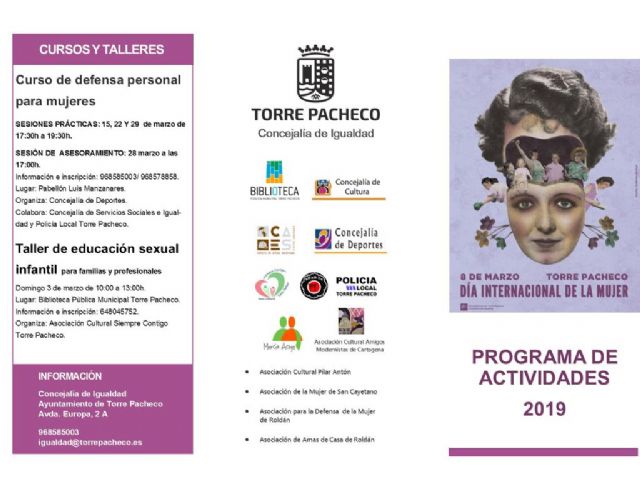 El Ayuntamiento de Torre Pacheco a través de la Concejalía de Igualdad, en colaboración con asociaciones y colectivos, ha programado diferentes actividades, con las que poner de manifiesto la importancia de esta fecha. Actividades donde encontramos cursos, talleres, deporte, exposiciones, charlas, teatro, que han empezado en el día de hoy con la presentación del programa de actividades y la colocación de la bandera por la igualdad, en el Ayuntamiento de Torre Pacheco y finalizan en el mes de abril.