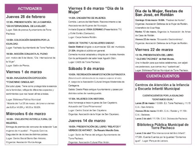 Un programa de actividades, que de una manera trasversal, trabaja la igualdad, y no solo durante el mes de marzo, tal como ha comentado la Concejala de Igualdad, destacando la importancia de trabajar en las edades más tempranas, con cuentacuentos y talleres. También, ha querido destacar el reconocimiento a mujeres del municipio por su trabajo y dedicación para poner en valor el asociacionismo y la igualdad en nuestro municipio, en un acto que se celebrará el viernes 8 de marzo en Roldán, otra actividad que ha mencionado Verónica Martínez, ha sido la "Recreación de una manifestación Sufragista", una reivindicación del derecho de las mujeres a ejercer el voto, a cargo de la Asociación Cultural Amigos Modernistas de Cartagena, el sábado 9 de marzo; presentaciones de libros, exposiciones, encuentros interculturales, teatro, homenajes, cursos, y talleres, completan este programa de actividades organizado por la concejalía de Igualdad del Ayuntamiento de Torre Pacheco; y del que Verónica Martínez, ha querido invitar a participar a los vecinos y vecinas del municipio.