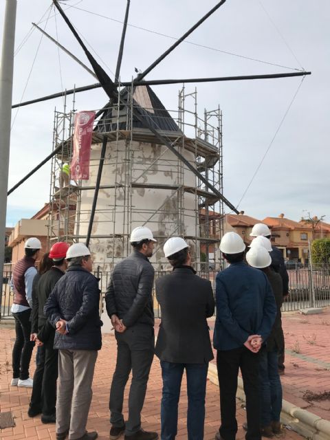 El alcalde de Torre Pacheco, Antonio León, acompañado por el concejal de Urbanismo, Alberto Galindo, y el concejal de Cultura y Turismo, Raúl Lledó, así como miembros de la Corporación Municipal, técnicos municipales, y el director de la empresa PEGIRO, Cecilio Almagro y la arquitecta de la empresa, Caridad Martínez, realizaron una visita para supervisar las obras de rehabilitación que se están llevando a cabo en el Molino del Tío Farroco.