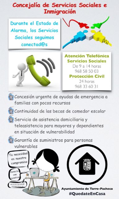 Ante la crisis sanitaria provocada por el coronavirus, la Concejalía de Servicios Sociales, del Ayuntamiento de Torre Pacheco presta los servicios en la modalidad de atención telefónica en horario de 9 a 14 horas en el número de teléfono 968 585 003.