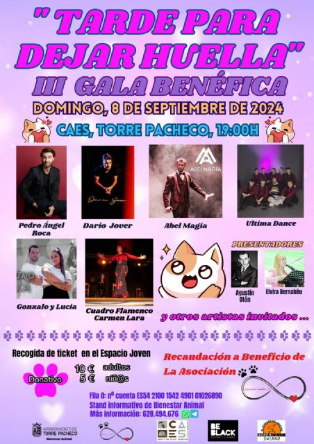 La Asociación de Bienestar Animal y Medioambiente DEJANDO HUELLA TP y la Concejalía de Bienestar Animal del Ayuntamiento de Torre Pacheco organizan esta tercera gala benéfica a beneficio de la Asociación.