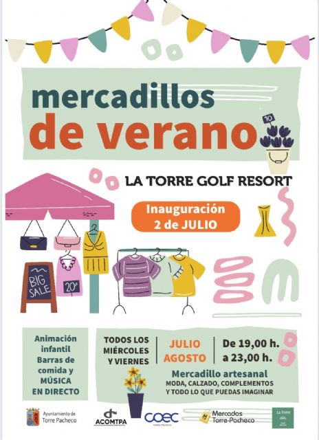 El Ayuntamiento de Torre Pacheco y COEC Torre Pacheco organizan una nueva edición de Los Mercadillos de Verano que tradicionalmente se vienen celebrando en la urbanización La Torre Golf Resort, con el objetivo de fomentar el comercio local del municipio y dinamizar las noches de verano.