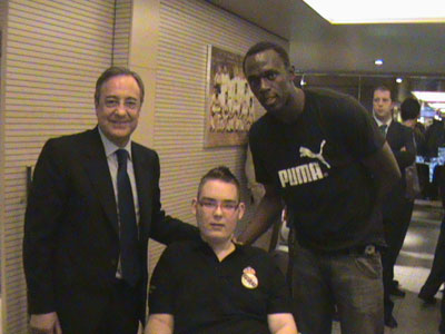 José Ángel, que desde los nueve años está en una silla de ruedas por una enfermedad que dificulta cada día más su vida cotidiana, pudo conocer a sus ídolos del Madrid, al presidente del Club, Florentino Pérez, al jugador español de la NBA, José Manuel Calderón, y al gran plusmarquista, Usain Bolt, quien realizó el saque de honor del partido.