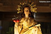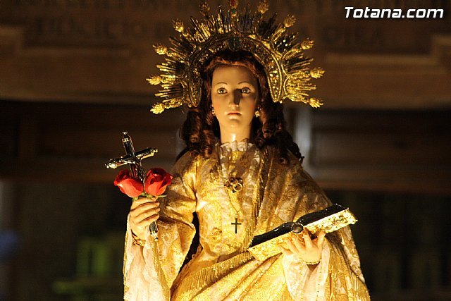 Autoridades municipales, civiles y religiosas y miembros de La Fundación La Santa, además de varios cientos de personas, han acompañado a la imagen de la Patrona de Totana, Santa Eulalia, en una solemne procesión celebrada ayer con motivo de su onomástica, que ha recorrido esta tarde las calles de la localidad, coincidiendo con la festividad local.