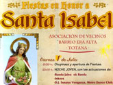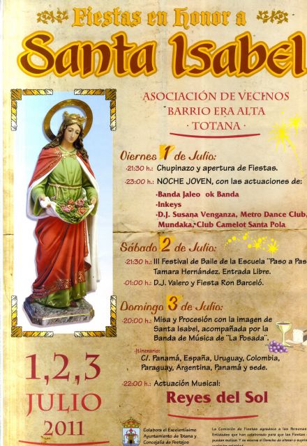 Las fiestas del barrio de La Era Alta, organizadas por la Asociación de Vecinos del barrio en colaboración con el Ayuntamiento de Totana, en honor a Santa Isabel arrancan mañana viernes 1 de julio con el chupinazo y la noche joven en la que actuarán varios grupos de música.