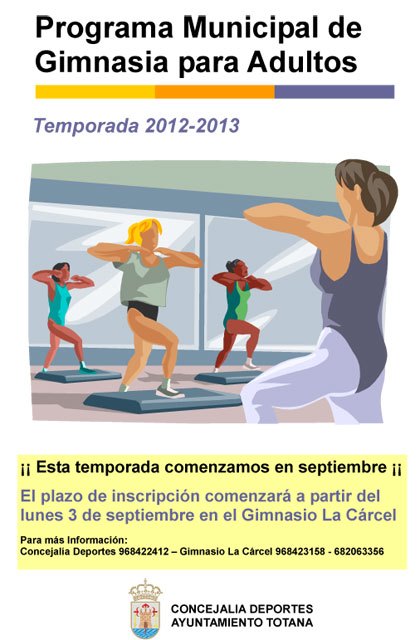 La Concejalía de Deportes ha ofertado para esta temporada 2012/13 el Programa Municipal de Gimnasia para Adultos, con la oferta de actividades como Gimnasia de Mantenimiento, Gimnasia especial para la columna, Gimnasia para personas Mayores y Gimnasia para Discapacitados.