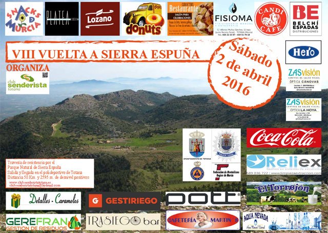 El Club Senderista Totana, tiene previsto organizar el próximo 2 de abril del 2016, la "VIII VUELTA A SIERRA ESPUÑA", con el objeto de promover entre los participantes del evento y sus acompañantes , los encantos del Parque Natural de Sierra Espuña, sus municipios, así; como sus servicios y ofertas gastronómicas y hoteleras.