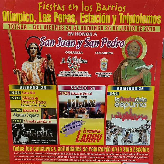 Las fiestas de los barrios Olímpico, Las Peras, La Estación y Triptolemos, en honor a San Juan y San pedro, se celebran este próximo fin de semana del 24 al 26 de junio con un variado y amplio programa de actividades.