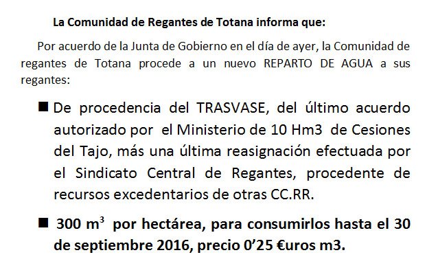 Por acuerdo de la Junta de Gobierno en el día de ayer, la Comunidad de regantes de Totana procede a un nuevo REPARTO DE AGUA a sus regantes: