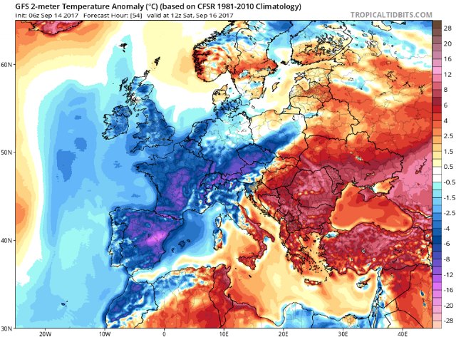 Nos encontramos a las puertas de un brusco cambio de tiempo que se va a traducir en temperaturas bajas para esta época del año y algunos chubascos o tormentas. El cambio ya ha comenzado en el norte de España, pero, a lo largo del día de mañana, se extenderá a toda la península (el descenso de las temperaturas, porque las lluvias solamente afectarán al norte y al mediterráneo).