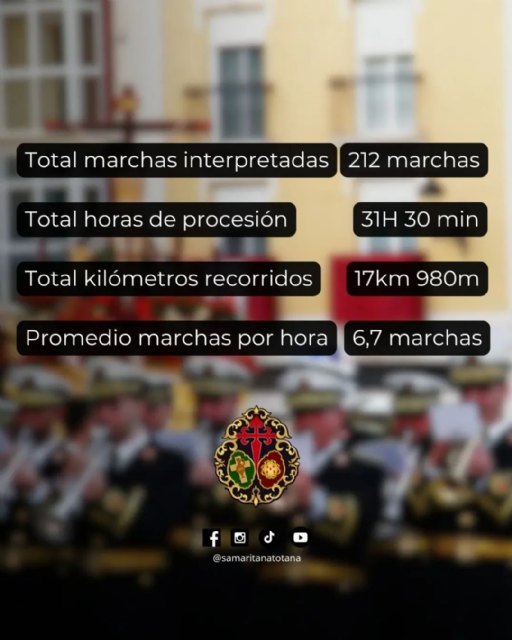 Comparado con estándares habituales, donde una agrupación promedio interpreta entre 150 y 180 marchas en Semana Santa, los 212 de La Samaritana reflejan un esfuerzo sobresaliente y un compromiso admirable. La Agrupación Musical La Samaritana ha demostrado, una vez más, ser un pilar fundamental en la Semana Santa de Totana y un referente en la región de Murcia y limítrofes.