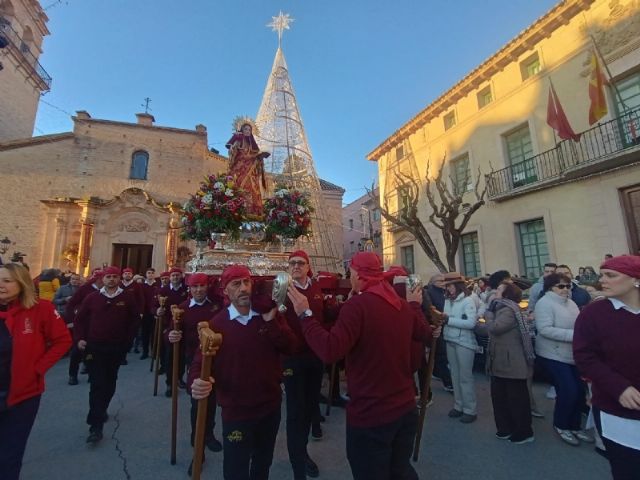 La jornada festiva arranco a las ocho de la mañana, momento en el que se ofició una misa de despedida en la parroquia de Santiago El Mayor, lugar donde llegó el pasado 9 de diciembre para pasar las fiestas patronales y las Navidades. Tras la misa, a las nueve en punto arrancó el cortejo de los romeros acompañando a La Santa.