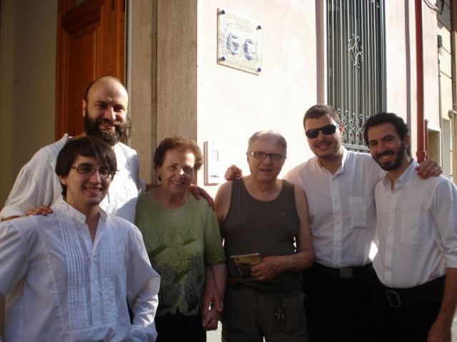 Con los dueños de la Pensión de Viarreggio a la hora de despedirnos. Les obsequiamos con nuestra música por lo bien que se portaron con nosotros.