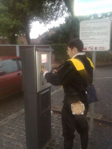 Una pegatina en la señal de tráfico y otra en el parquímetro.