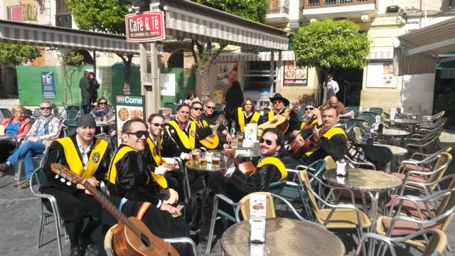 Un grupo de la Tuna de la Facultad de Medicina de la Univerisdad de Murcia amenizando la plaza de la catedral de Murcia tras el acto de la presentación del cartel.
