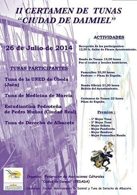 Tras haber estado en mayo en Valladolid (donde ganamos) y en junio en Lisboa, (donde quedamos terceros), ahora en julio nos toca ir a Daimiel (Ciudad Real) a medir nuestras fuerzas con la Tuna de Derecho de Albacete, la Tuna de la UNED de Úbeda y la Estudiantina Pedrotena de Ciudad Real.
