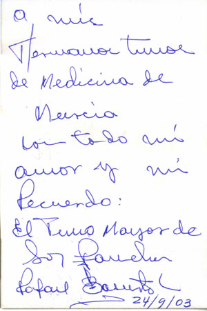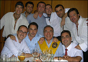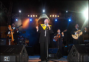 Posteriormente estuvimos con ellos en la actuación donde nos invitaron a subir al escenario a cantar juntos ante un público entregado a la magia del bolero y al carisma y simpatía de Rafael Basurto que hacía gala de su condición de Tuno Mayor honorífico de nuestra tuna. Desde ese momento hasta el final de la actuación todos los integrantes de “Los Panchos” actuaron con la beca de la Tuna de Medicina en el pecho haciendo publicidad y gala de lo que honoríficamente son... tunos de la Tuna de Medicina de Murcia.