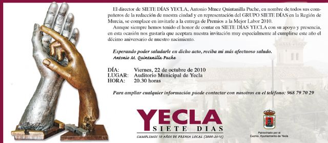 Este año celebramos también que cumplimos nuestro décimo aniversario desde que nacimos el 30 de mayo del año 2000, como El Faro de Yecla, y desde 2007 como SIETE DÍAS YECLA y Grupo Editorial Siete Días en la Región de Murcia (Yecla, Jumilla, Alcantarilla y Murcia).