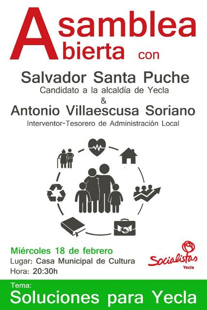 Los socialistas yeclanos celebran este miércoles 18 de febrero una nueva asamblea abierta donde todos los ciudadanos que lo deseen podrán preguntar y plantear sus ideas e iniciativas ante el candidato a la alcaldía de Yecla, Salvador Santa, y el interventor-tesorero de Admón. Local, Antonio Villaescusa, quien además fuera candidato a la alcaldía en las pasadas elecciones municipales.