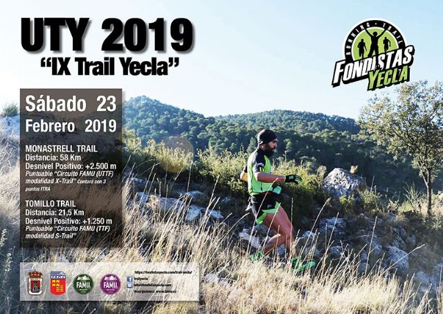 A las 10:00h. dará comienzo la Tomillo Trail sobre un recorrido de 21km. en sentido circular, que supondrá la 9ª prueba puntuable del Trail Tour FAMU 2018/19. Continúa abierto el plazo de inscripción para ambas citas, bajo la organización del Club Fondistas Yecla, en colaboración con el Excmo. Ayuntamiento de Yecla y su Servicio Municipal de Deportes, así como la Federación de Atletismo de la Región de Murcia, a través de Alcanza Tu Meta (http://www.alcanzatumeta.es/inscripcionp1.php?id=392763) hasta el 20 de febrero o alcanzar el límite de inscritos en ambas distancias.